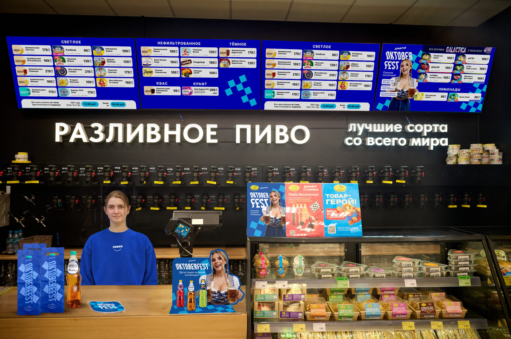 Алексей: Задач у такого продвижения на самом деле сразу несколько. Первая – выделяться на рынке и постоянно быть актуальными и интересными для покупателя. Смена цветовой гаммы во всех POS-материалах и униформе продавцов, обновление коллекции напитков на дегустационной стойке, свежие образы в рекламе и приложении – та важная визуальная часть, которая в первую очередь считывается клиентами. Вторая задача – подсвечивать новинки на стойке розлива. Осенью мы представим покупателям новый сорт пива, а также новые вкусы «Галактики» и лимонада. Важно их предлагать пробовать, что само по себе вносит интерактив во взаимодействие с покупателями. Третья задача – глобальная: нам нужно изменить отношение к разливному. В помощь – модное слово «драфт». Чтобы весь персонал и партнеры быстрее привыкли пользоваться именно этим определением самого маржинального продукта сети, мы во всех брифах, папках 1С, рекламе – пишем «драфт», а не розлив.